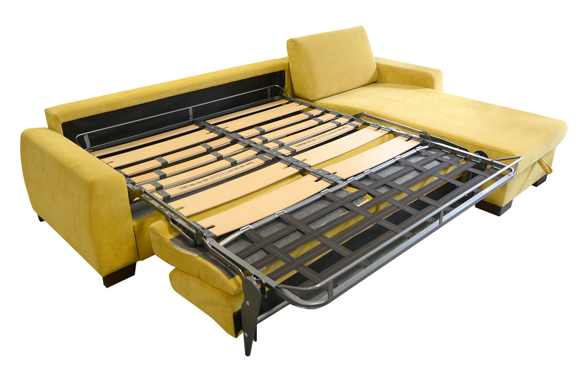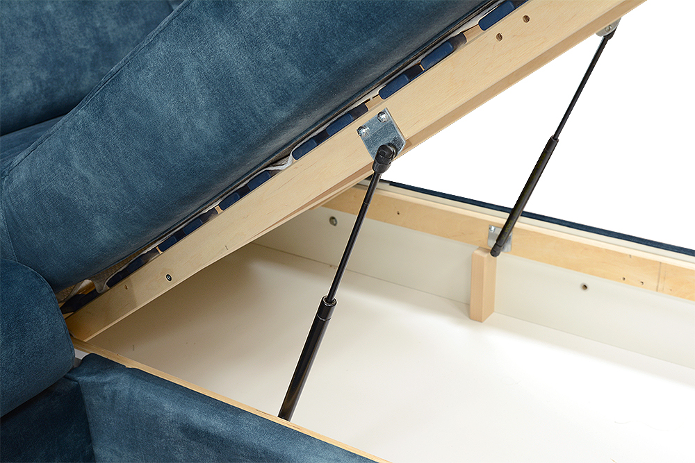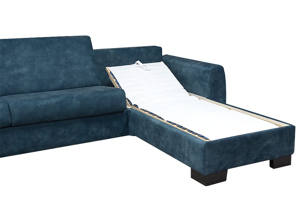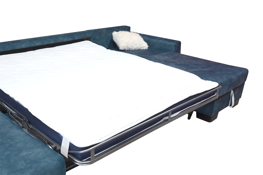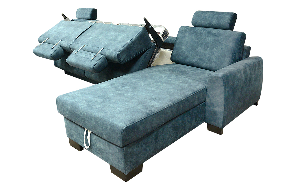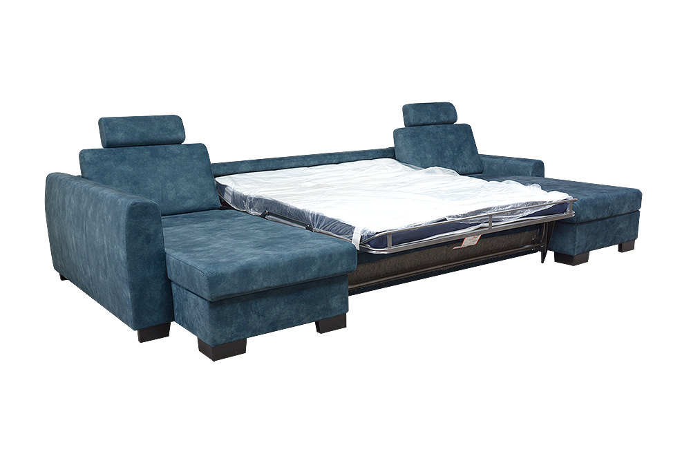 Navrhli sme priestrannú sedaciu súpravu v tvare U so širokým funkčným využitím. Najväčšou výhodou sedacej súpravy je, že po rozklade sa na nej vyspia pohodlne až štyri osoby, dve na preklápacom talianskom mechanizme, a dve osoby na krajných elementoch. Krajné elementy majú klasické lamelové rošty upevnené na pneumatických piestoch, ktoré zaručujú jednoduchú manipuláciu s roštom. Pod roštom je navyše šikovný odkladací, resp. úložný priestor, kde si môžete odložiť deku, alebo vankúše. Rošt je potiahnutý špeciálnou látkou ANTI-SLIP, ktorá zabraňuje pohybu matraca.