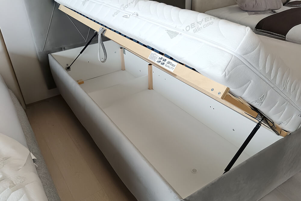 Čalúnená posteľ má v štandarde veľký úložný priestor, dostupný po vyklopení roštov.