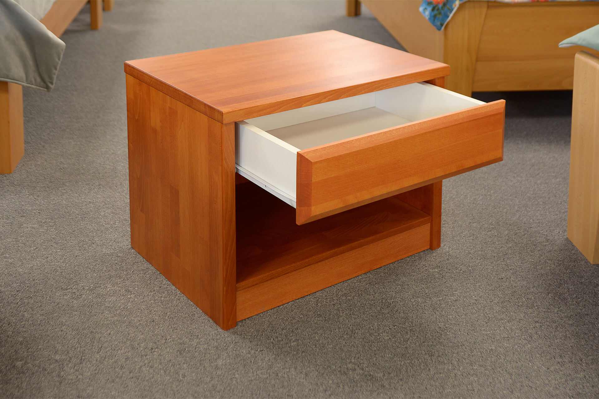 Pekné, do detailu opracované línie na každej hrane stolíka Vás musia chytiť za srdce už na prvý pohľad. Stolík má jednu zásuvku, a pod zásuvkou je voľný otvorený úložný priestor. Stolík pasuje napríklad ku posteli Mate Lux, Elinor, alebo aj k iným. Farebný odtieň stolíka si môžete zvoliť podľa nášho vzorkovníka morenia.