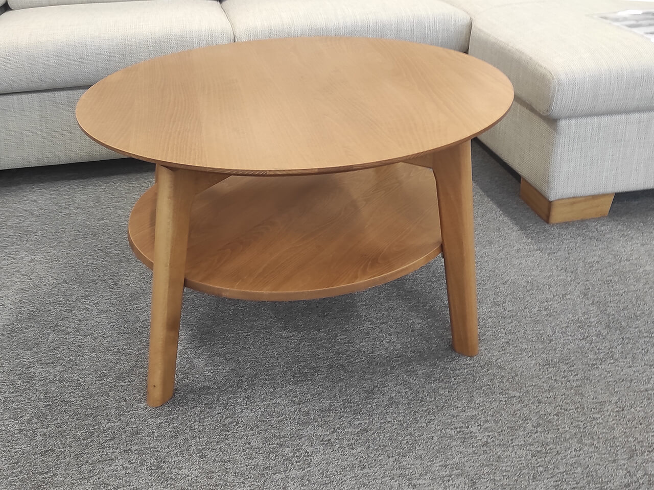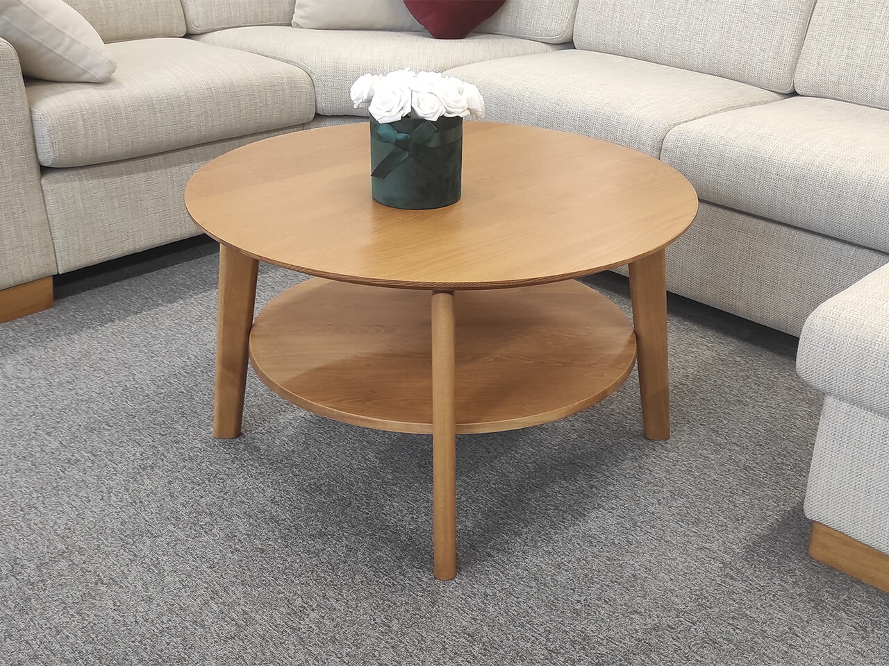 Jednoduchý konferenčný stolík v škandinávskom dizajne. Stolík stojí na štyroch nohách, ktoré opticky zachádzajú do stredu vrchnej dosky. Úložný priestor v stolíku je otvorený, tvorí ho ďalšia kruhová doska, ktorá sa nachádza pod vrchnou doskou. Stolík má opracované šikmé hrany po obvode celej vrchnej stolíkovej dosky, čo vytvára pekný detail. Ak hľadáte aj sedaciu súpravu, tak si pozrite našu ponuku.