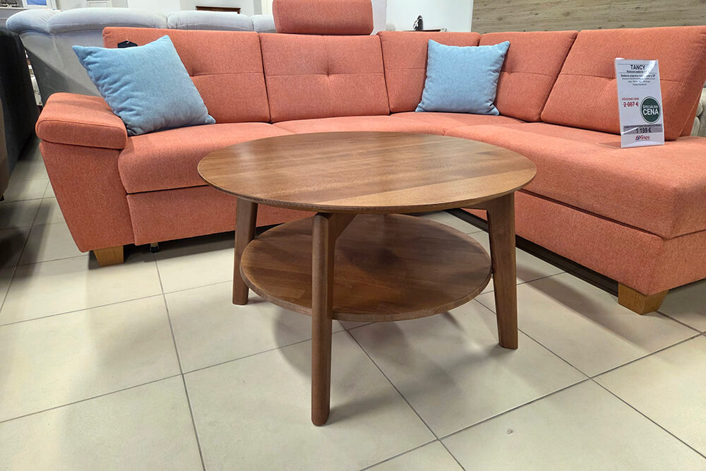 Jednoduchý konferenčný stolík v škandinávskom dizajne. Stolík stojí na štyroch nohách, ktoré opticky zachádzajú do stredu vrchnej dosky. Úložný priestor v stolíku je otvorený, tvorí ho ďalšia kruhová doska, ktorá sa nachádza pod vrchnou doskou. Stolík má opracované šikmé hrany po obvode celej vrchnej stolíkovej dosky, čo vytvára pekný detail. Ak hľadáte aj sedaciu súpravu, tak si pozrite našu ponuku.