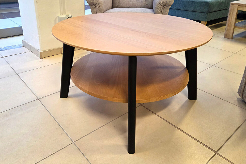 Jednoduchý konferenčný stolík v škandinávskom dizajne. Stolík stojí na štyroch nohách, ktoré opticky zachádzajú do stredu vrchnej dosky. Úložný priestor v stolíku je otvorený, tvorí ho ďalšia kruhová doska, ktorá sa nachádza pod vrchnou doskou. Stolík má opracované šikmé hrany po obvode celej vrchnej stolíkovej dosky, čo vytvára pekný detail. Ak hľadáte aj sedaciu súpravu, tak si pozrite našu ponuku.