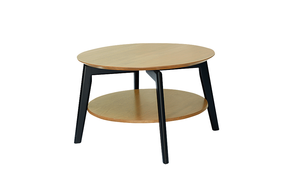 Jednoduchý konferenčný stolík v škandinávskom dizajne. Stolík stojí na štyroch nohách, ktoré opticky zachádzajú do stredu vrchnej dosky. Úložný priestor v stolíku je otvorený, tvorí ho ďalšia kruhová doska, ktorá sa nachádza pod vrchnou doskou. Stolík má opracované šikmé hrany po obvode celej vrchnej stolíkovej dosky, čo vytvára pekný detail. Ak hľadáte aj sedaciu súpravu, tak si pozrite našu ponuku.