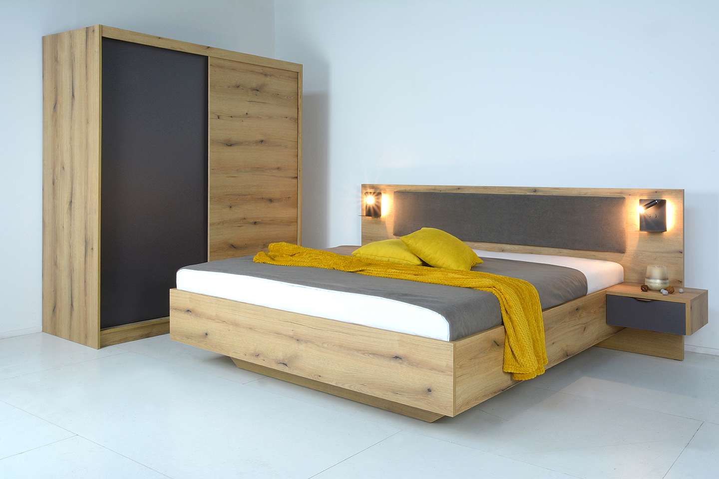 Mekenzy s laminovaným čelom s dvomi čalúnenými vankúšmi je moderná posteľ vyrobená z DTD lamina s levitujúcim efektom. Dominantou je očalúnená plocha na čele postele. Posteľ sa vyrába v dekore dub pobrežný. Posteľ v štandarde bez príplatkov je dodávaná bez roštu (s prípravou pre rošt) a bez úložného priestoru. Čalúnenú plochu na čele postele si môžete vybrať podľa dostupného vzorkovníka látok.