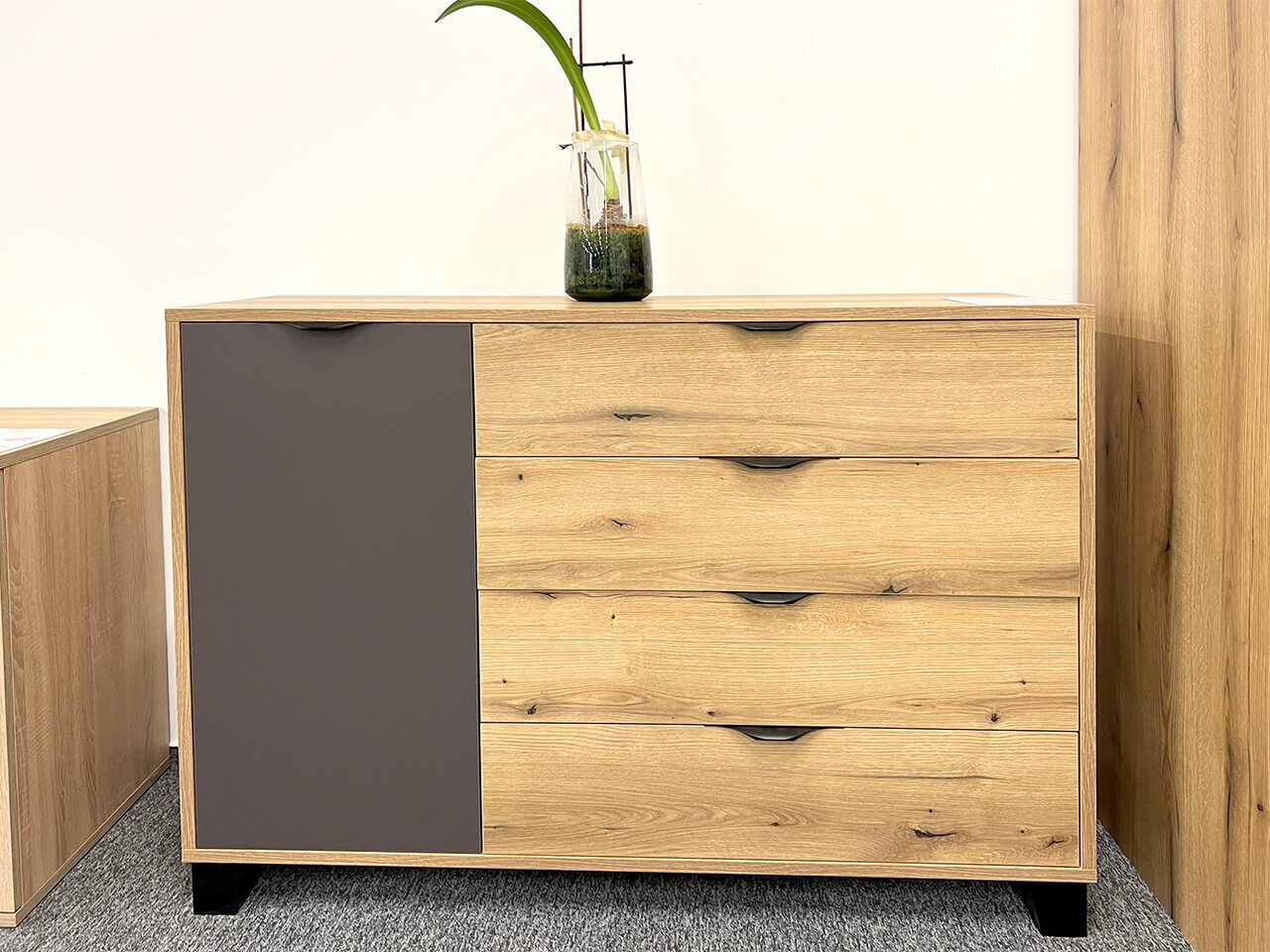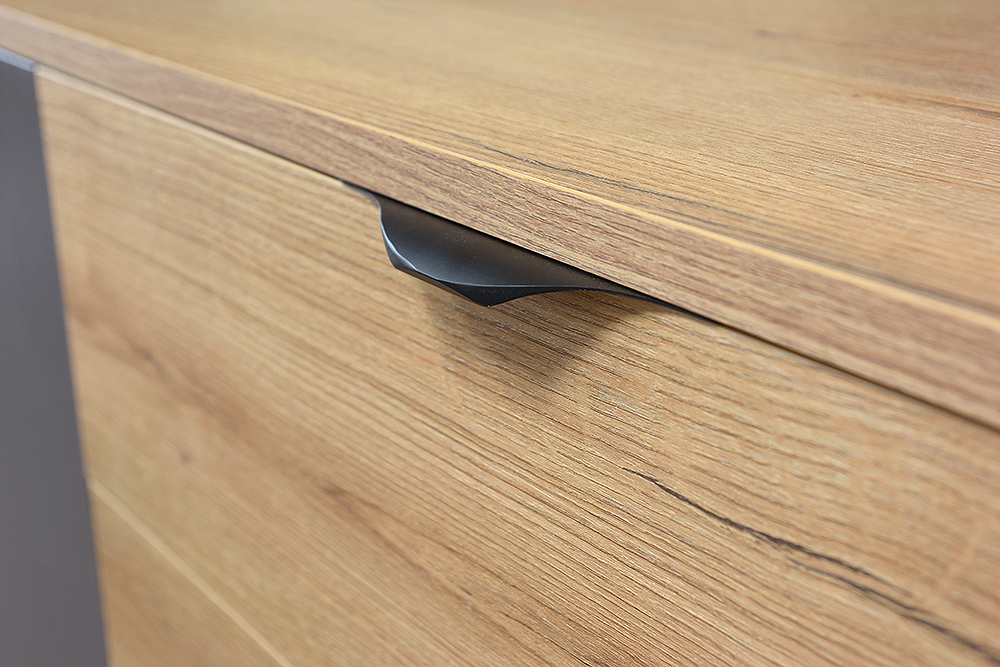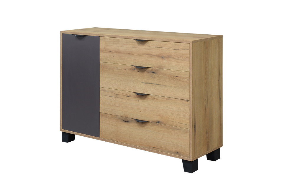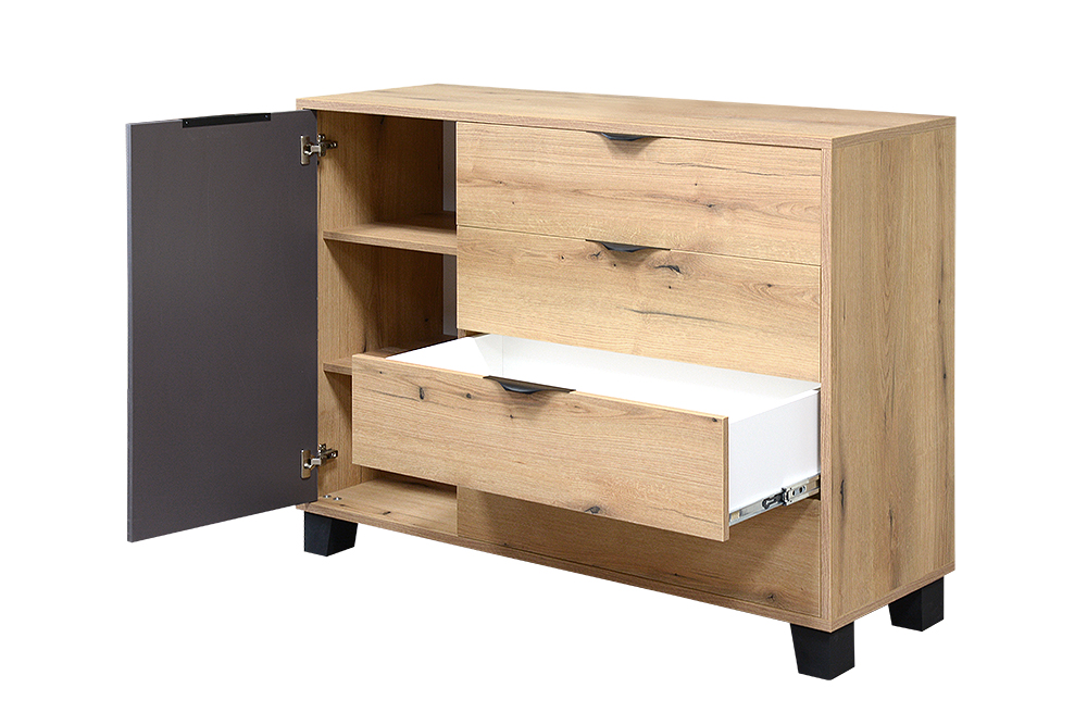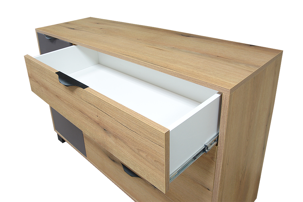 Moderná komoda Mekenzy vyrieši vaše problémy s úložným priestorom. Ľavá strana komody má tri poličky a pravá strana obsahuje štyri veľké zásuvky.