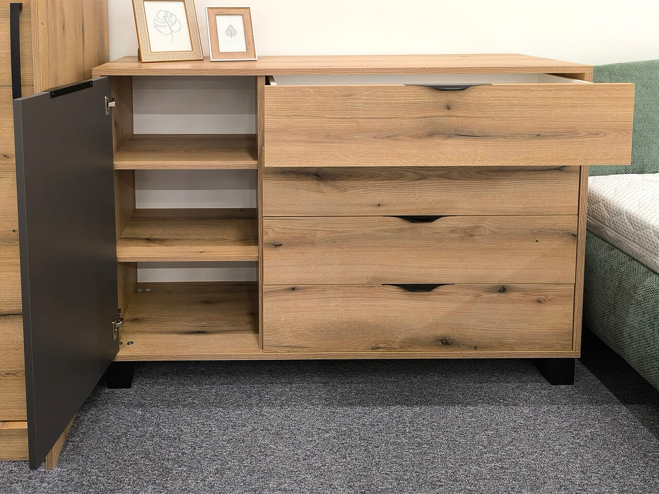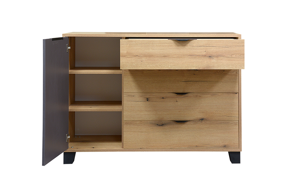 Moderná komoda Mekenzy vyrieši vaše problémy s úložným priestorom. Ľavá strana komody má tri poličky a pravá strana obsahuje štyri veľké zásuvky.