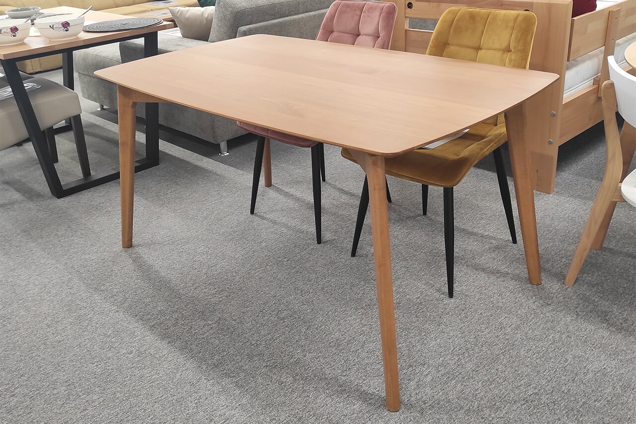 Stôl má vrchnú dosku vyrobenú z priebežnej bukovej škárovky. Zošikmené hrany po celom obvode dodávajú stolu celkový šmrnc. Farebné prevedenie si môžete zvoliť podľa Vašich preferencií zo vzorkovníka morenia FINES.