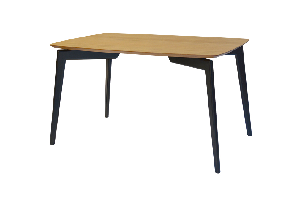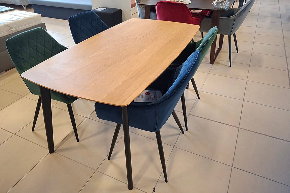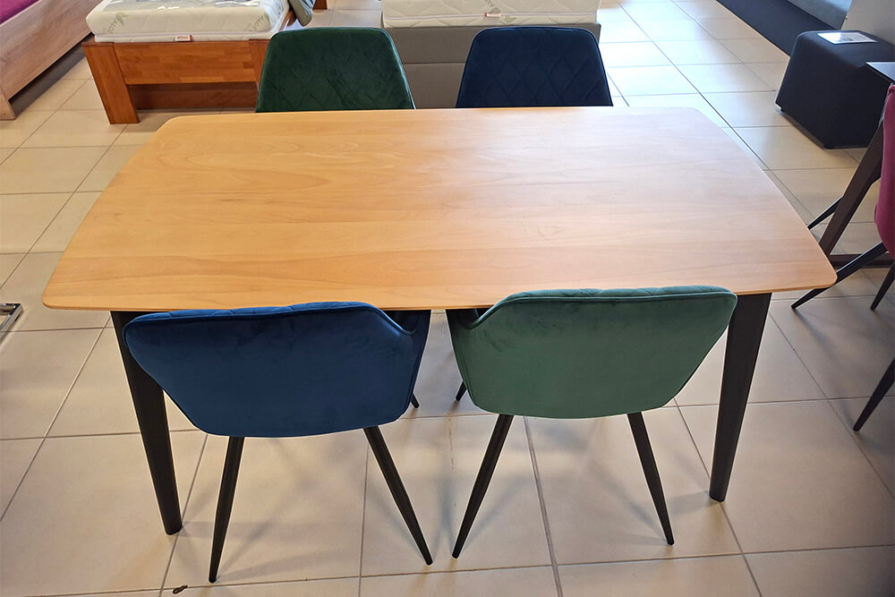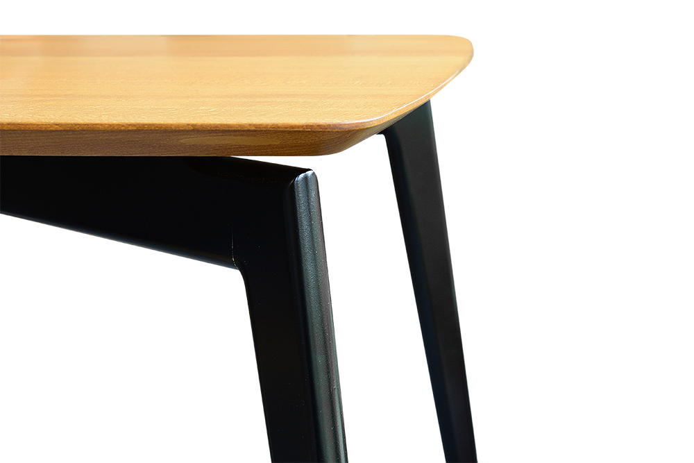 Stôl má vrchnú dosku vyrobenú z priebežnej bukovej škárovky. Zošikmené hrany po celom obvode stola sú výnimočným prvkom, ktorý ladí s oblými hranami nôh. Farebné prevedenie si môžete zvoliť podľa Vašich preferencií zo vzorkovníka morenia FINES. Nohy sú vždy v čiernom prevedení.