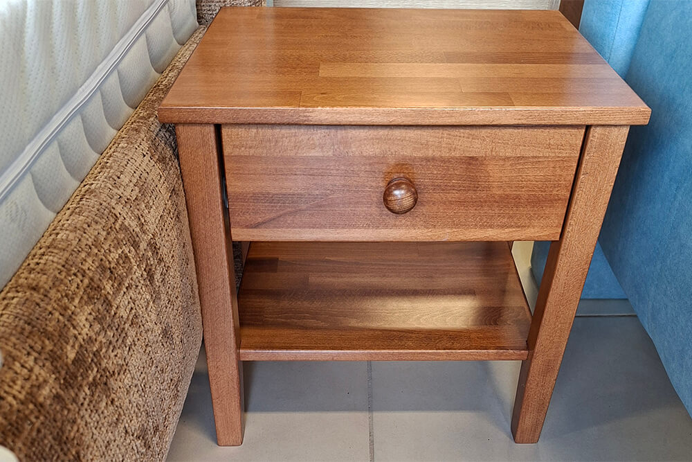 Masívny nočný stolík vyrobený z kvalitného bukového masívu. Stolík má jednu zásuvku a jednu otvorenú policu na odkladanie vecí. Nočný stolík sa perfektne hodí k posteli Talia.