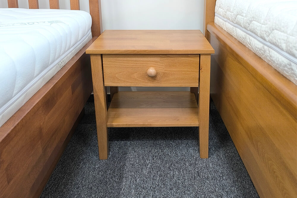 Masívny nočný stolík vyrobený z kvalitného bukového masívu. Stolík má jednu zásuvku a jednu otvorenú policu na odkladanie vecí. Nočný stolík sa perfektne hodí k posteli Talia.
